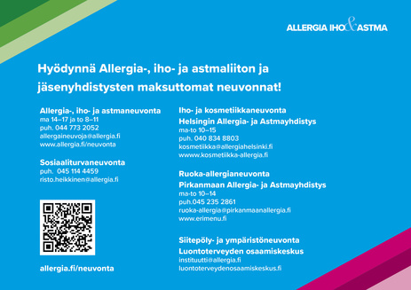 Helsiingin allergia- ja astmayhdistyksellä on valtakunnallinen maksuton iho- ja kosmetiikkaneuvonta, josta voi kysyä neuvoa tai tietoa kosmetiikka-allergioista tai ihonhoidosta: kosmetiikka@allergiahelsinki.fi tai p. 040 834 8803 (ma-to klo 10-15).