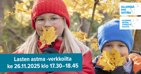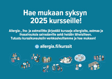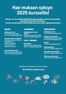 Tutustu myös muihin tuleviin kursseihin: Aidosti atooppinen -verkkokurssi 21.10.–17.11.2025 Astmaatikon painonhallinta -verkkokurssi 21.10.–15.12.2025 Pihisee ja puhisee (astmaa sairastavat) -verkkokurssi 18.11.–15.12.2025 | |