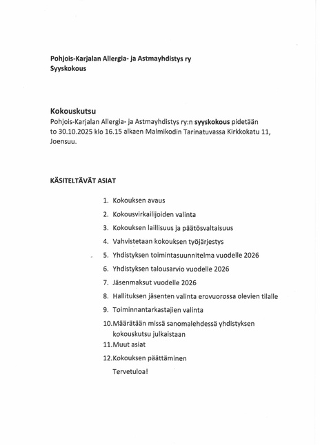Pohjois-Karjalan Allergia- ja Astmayhdistys ry Kirkkokatu 11, 80100 Joensuu p. 040 536 7537 puhelin on toistaiseksi pois käytöstä, pahoittelut.